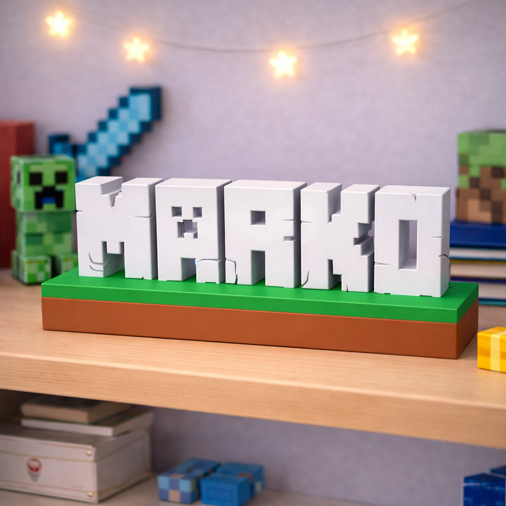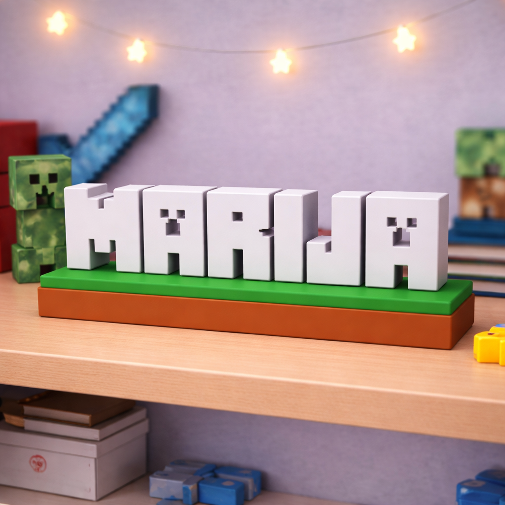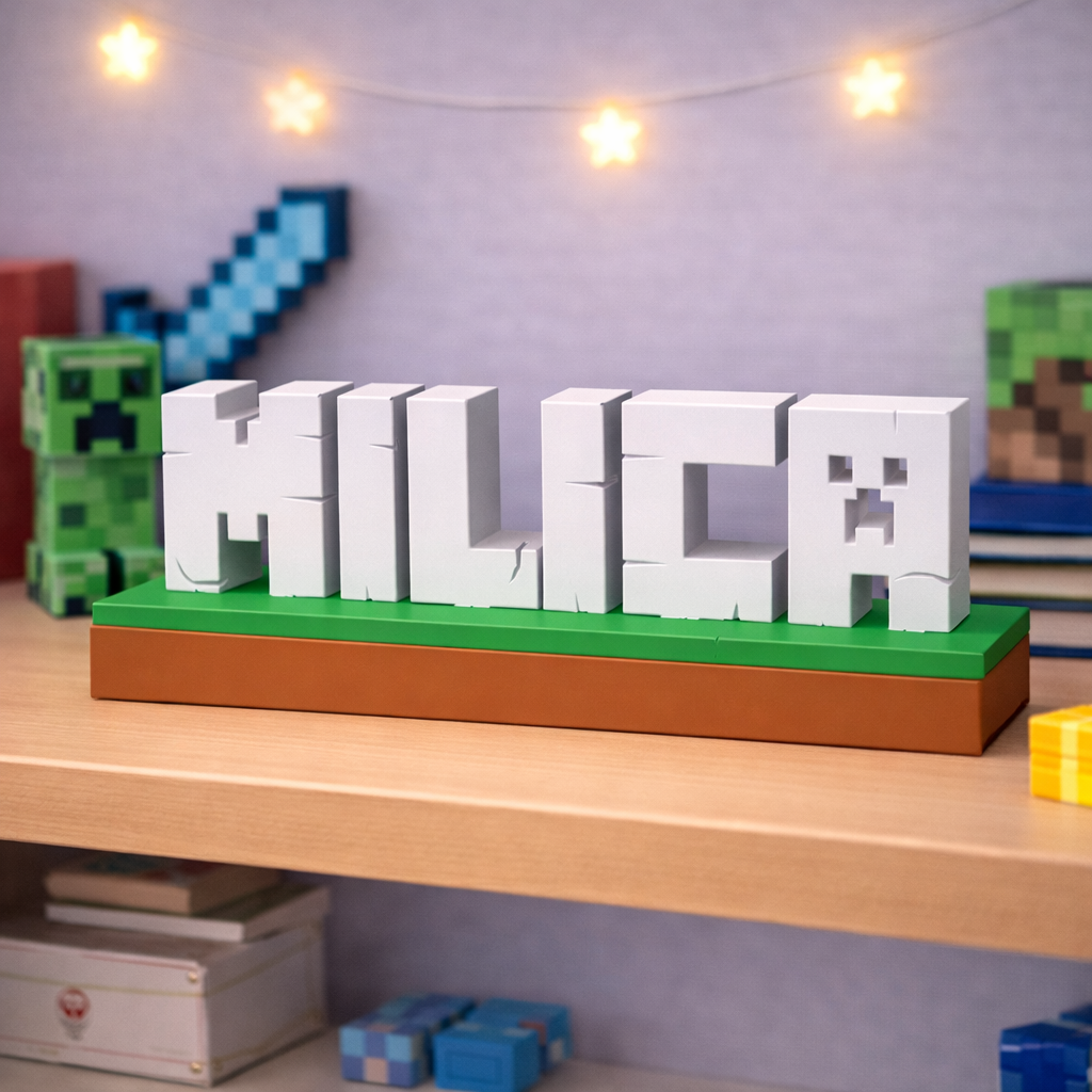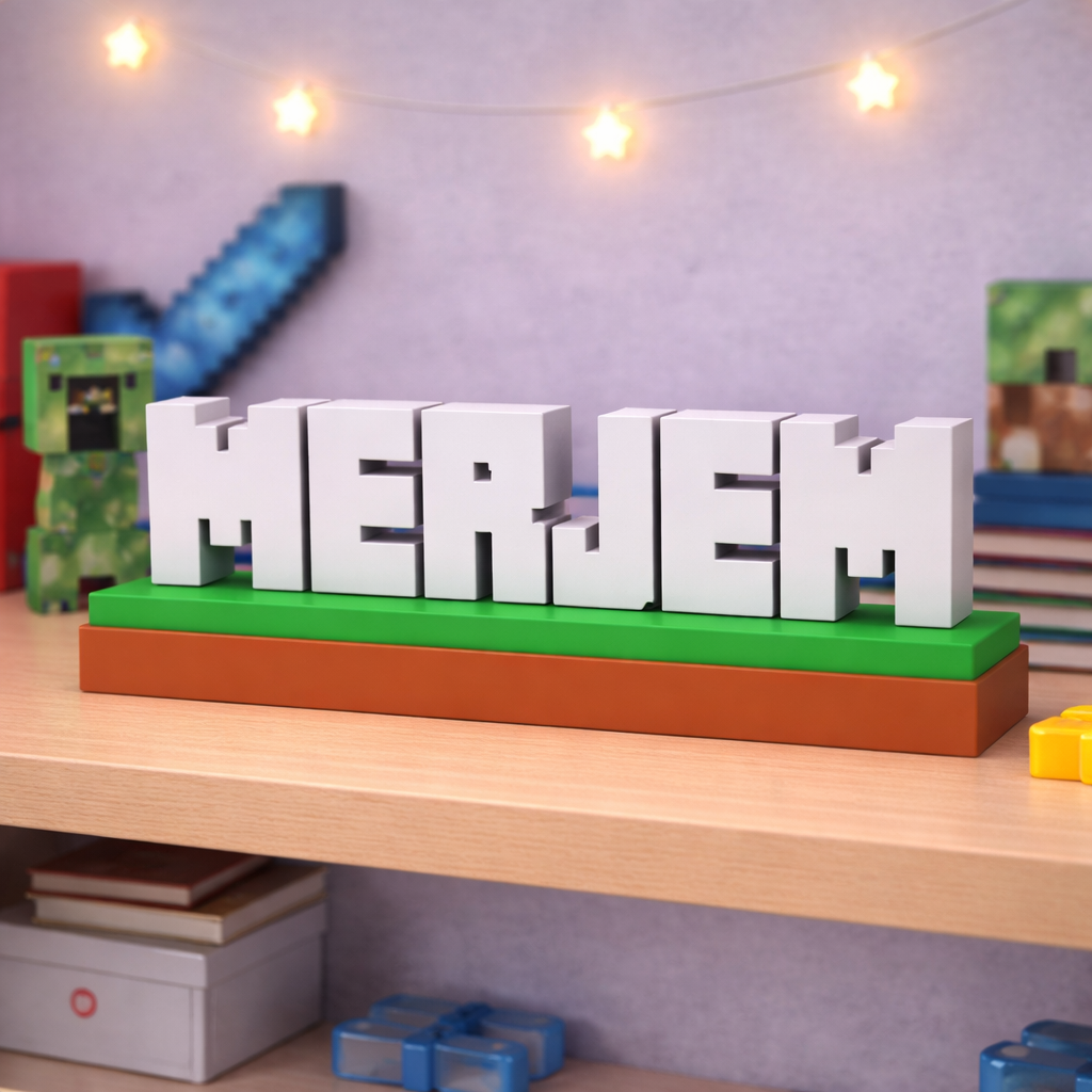 Unesite svijet Minecrafta u dječiju sobu uz potpuno personalizirani dekorativni natpis izrađen u prepoznatljivom blok stilu igre. Svako ime se izrađuje po narudžbi i pretvara u 3D blokove koji podsjećaju na Minecraft estetiku.