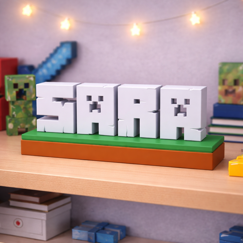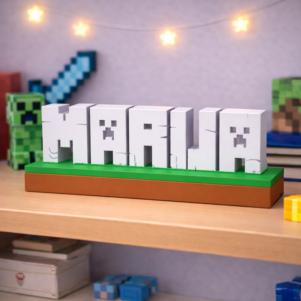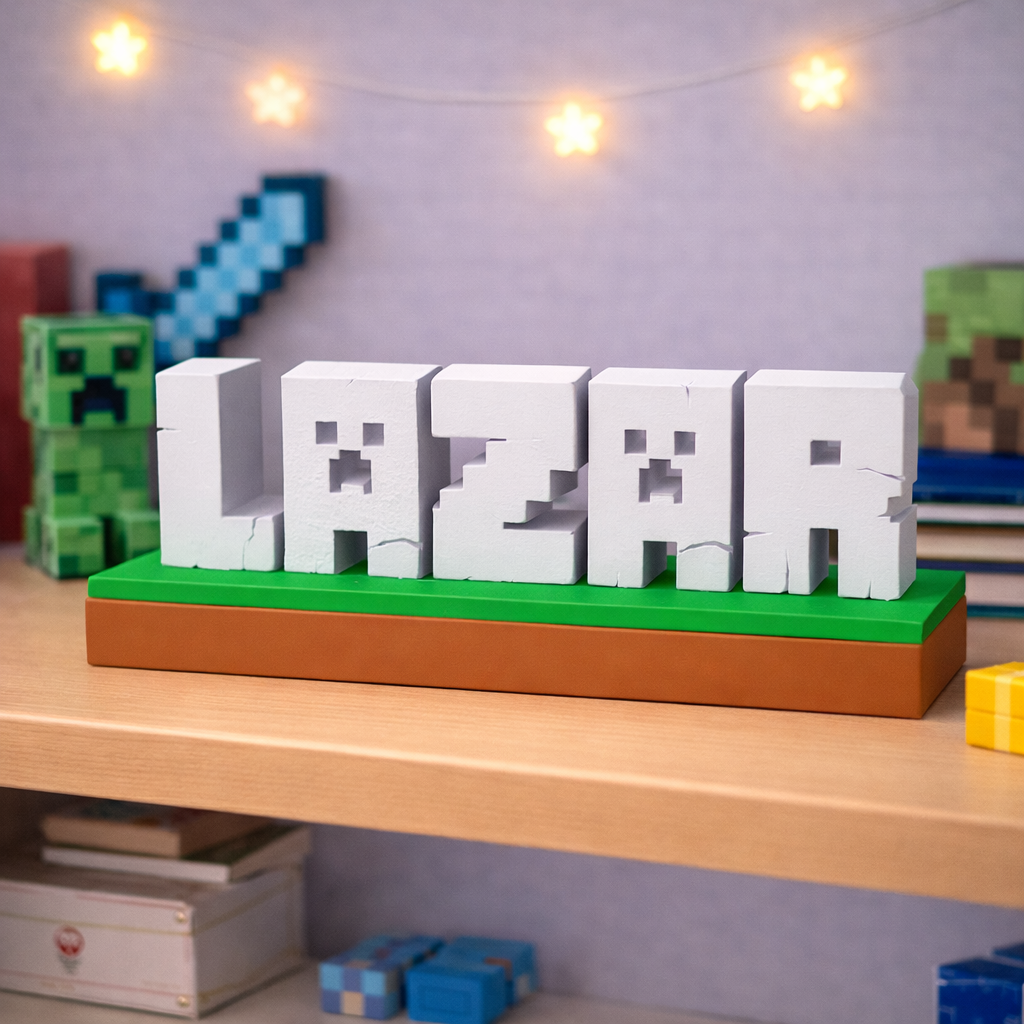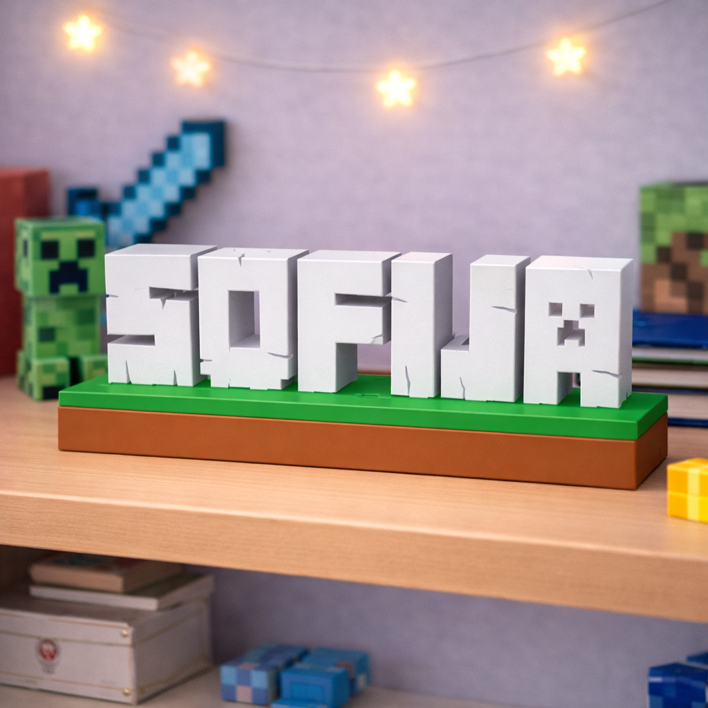 Unesite svijet Minecrafta u dječiju sobu uz potpuno personalizirani dekorativni natpis izrađen u prepoznatljivom blok stilu igre. Svako ime se izrađuje po narudžbi i pretvara u 3D blokove koji podsjećaju na Minecraft estetiku.