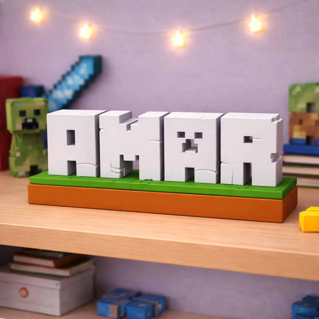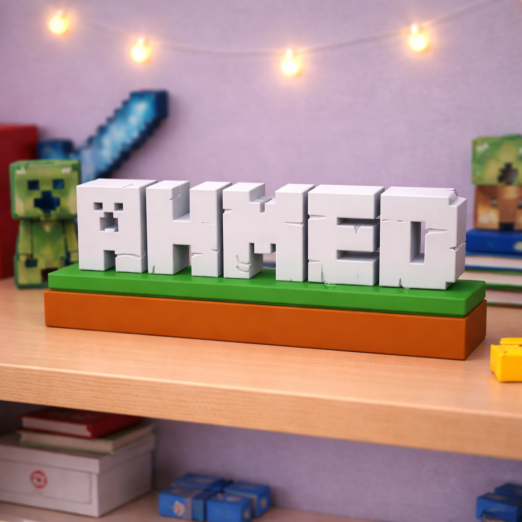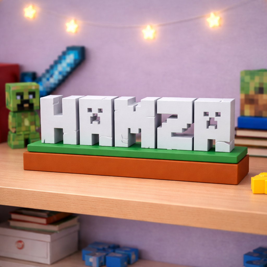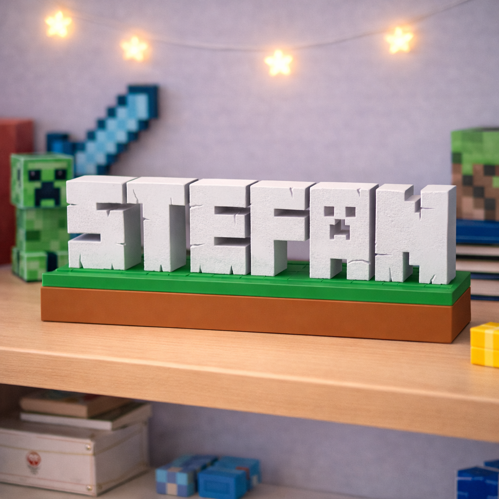 Unesite svijet Minecrafta u dječiju sobu uz potpuno personalizirani dekorativni natpis izrađen u prepoznatljivom blok stilu igre. Svako ime se izrađuje po narudžbi i pretvara u 3D blokove koji podsjećaju na Minecraft estetiku.