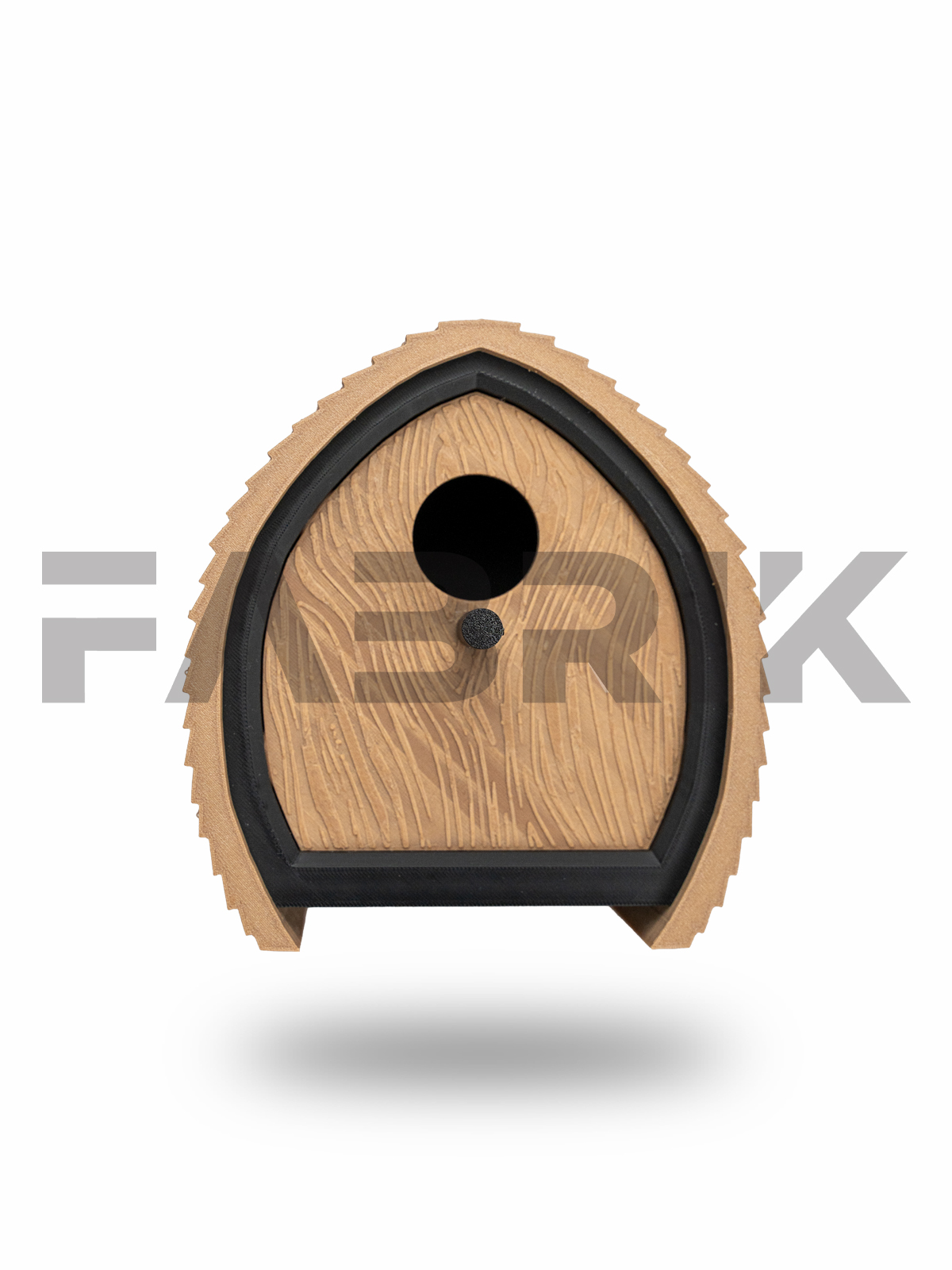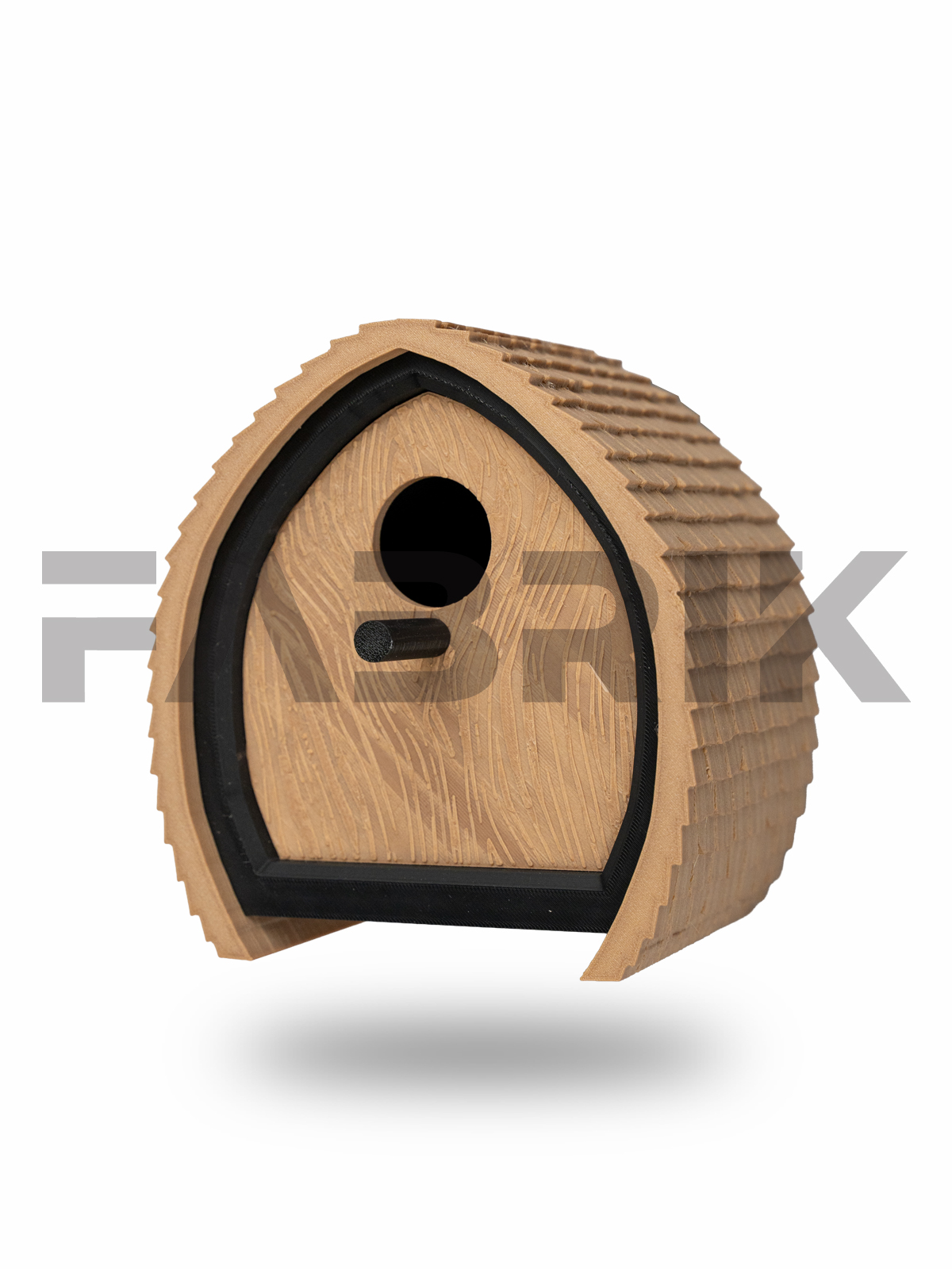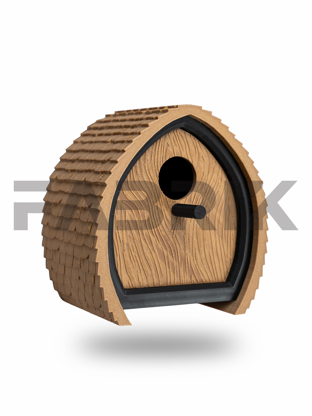 Dekorativna i funkcionalna kućica za sjenice, izrađena u prepoznatljivom rustičnom stilu s detaljnom teksturom drveta. Polukružni dizajn i prirodne boje savršeno se uklapaju u vrt, dvorište, voćnjak ili balkon, pružajući sigurno i ugodno mjesto za gniježđenje sjenica.